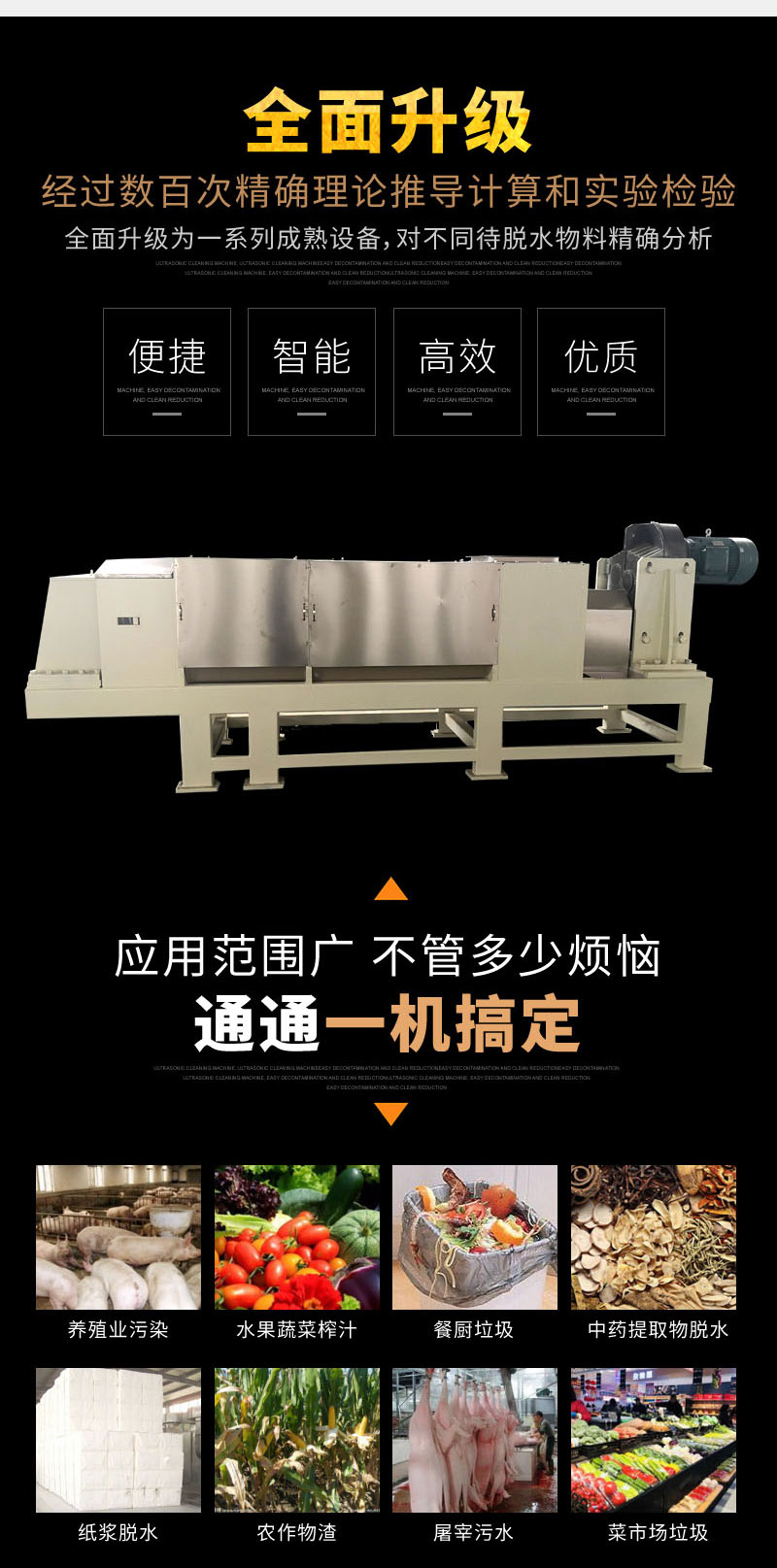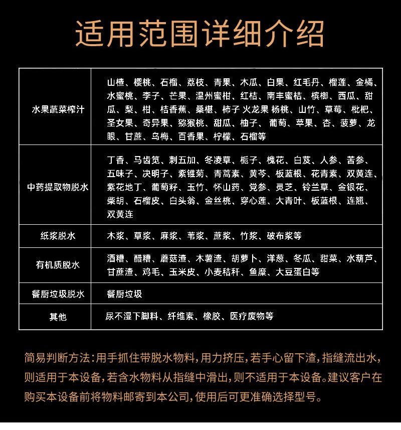 由于待脫水物料種類繁多,不同物料的含水率、分子水比例、粘度、纖維含量、吸水性、韌性、有機物或無機物等等數(shù)據(jù)各有不同,我公司工程師會根據(jù)每一位客戶提供的待脫水的物料進(jìn)行分析,計算出適用于該物料的參數(shù),制作出適合的設(shè)備,將物理壓榨作用利用到**,降低擠出物料含水率。